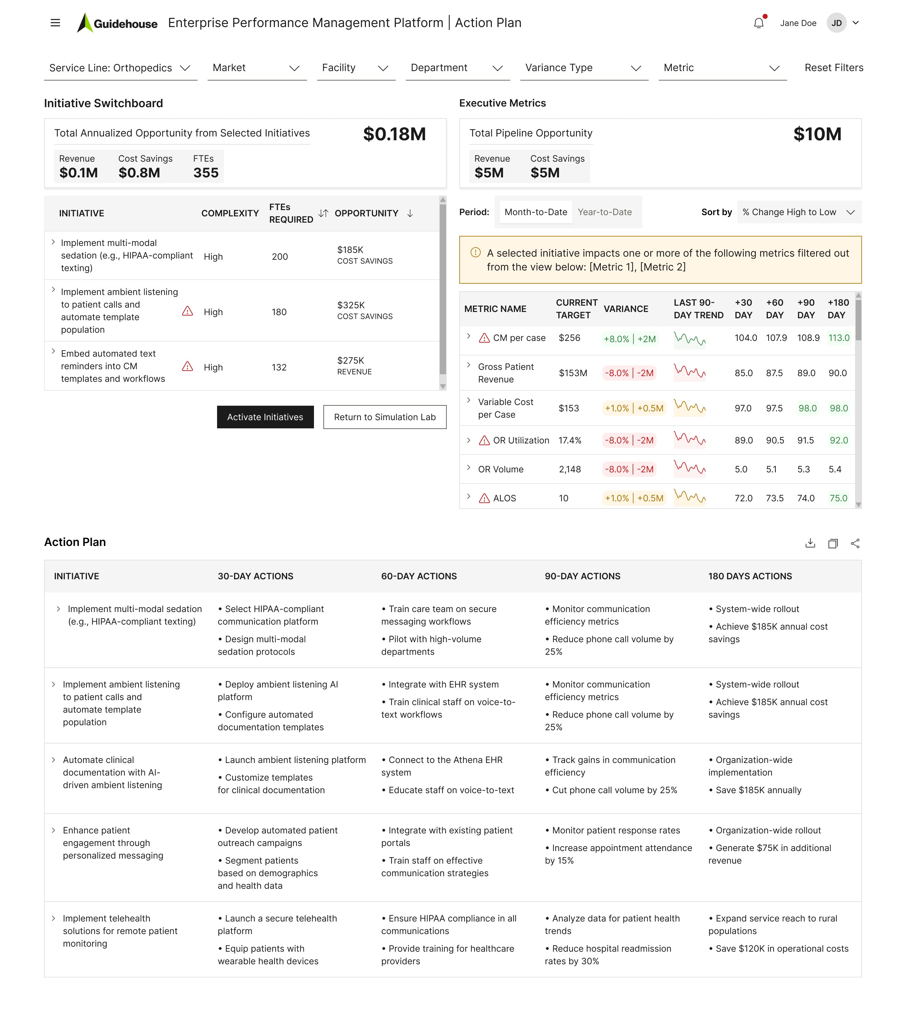 Example of modeling initiative impact and generating an execution-ready action plan.