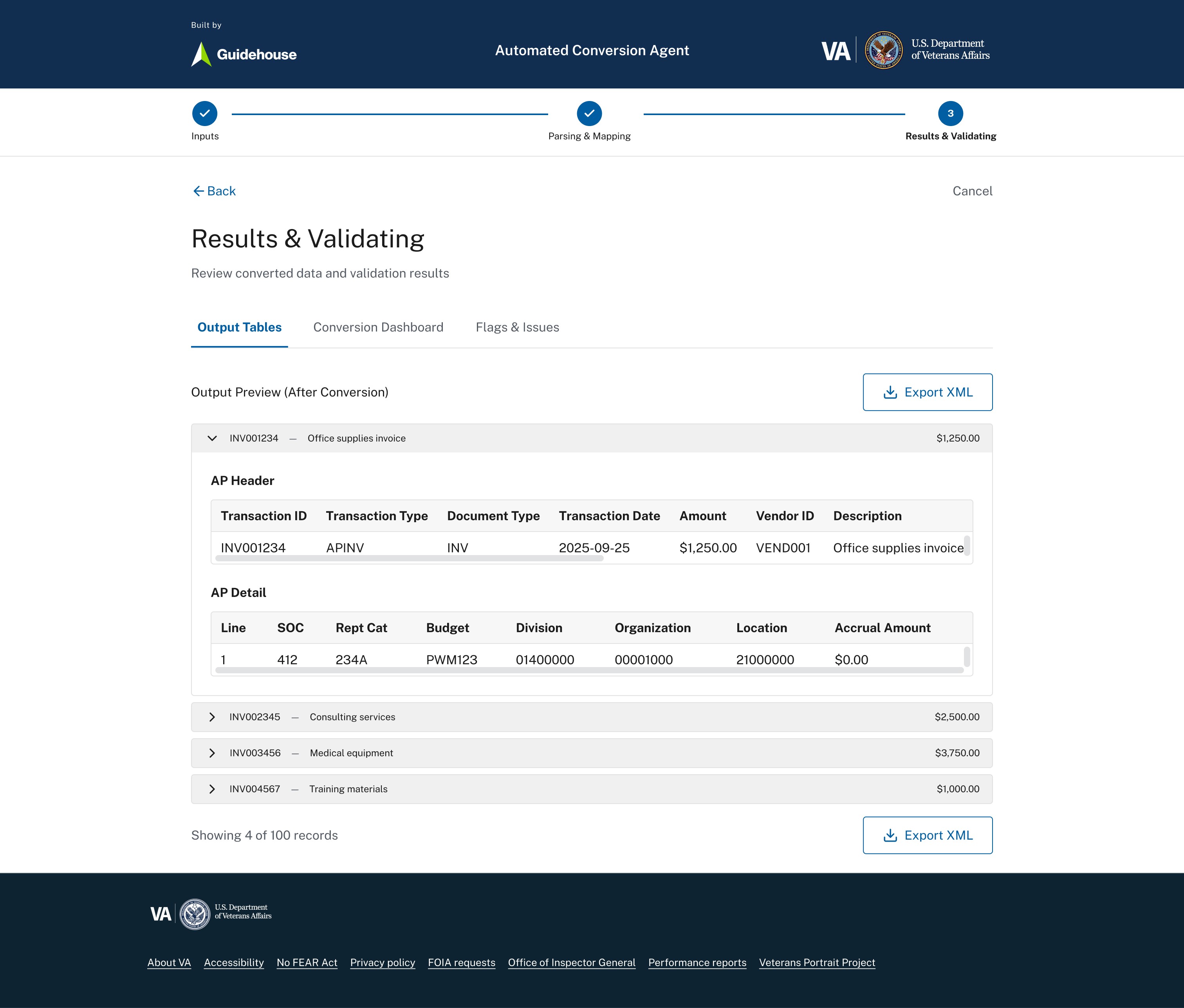 Detailed output view with expandable records and export-ready structure.